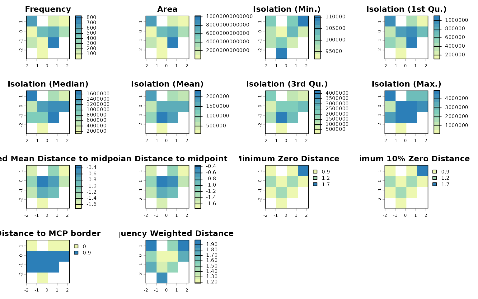 Each panel represents a different descriptor (e.g., distance to midpoint, distance to border, weighted isolation) mapped across the trait space.
