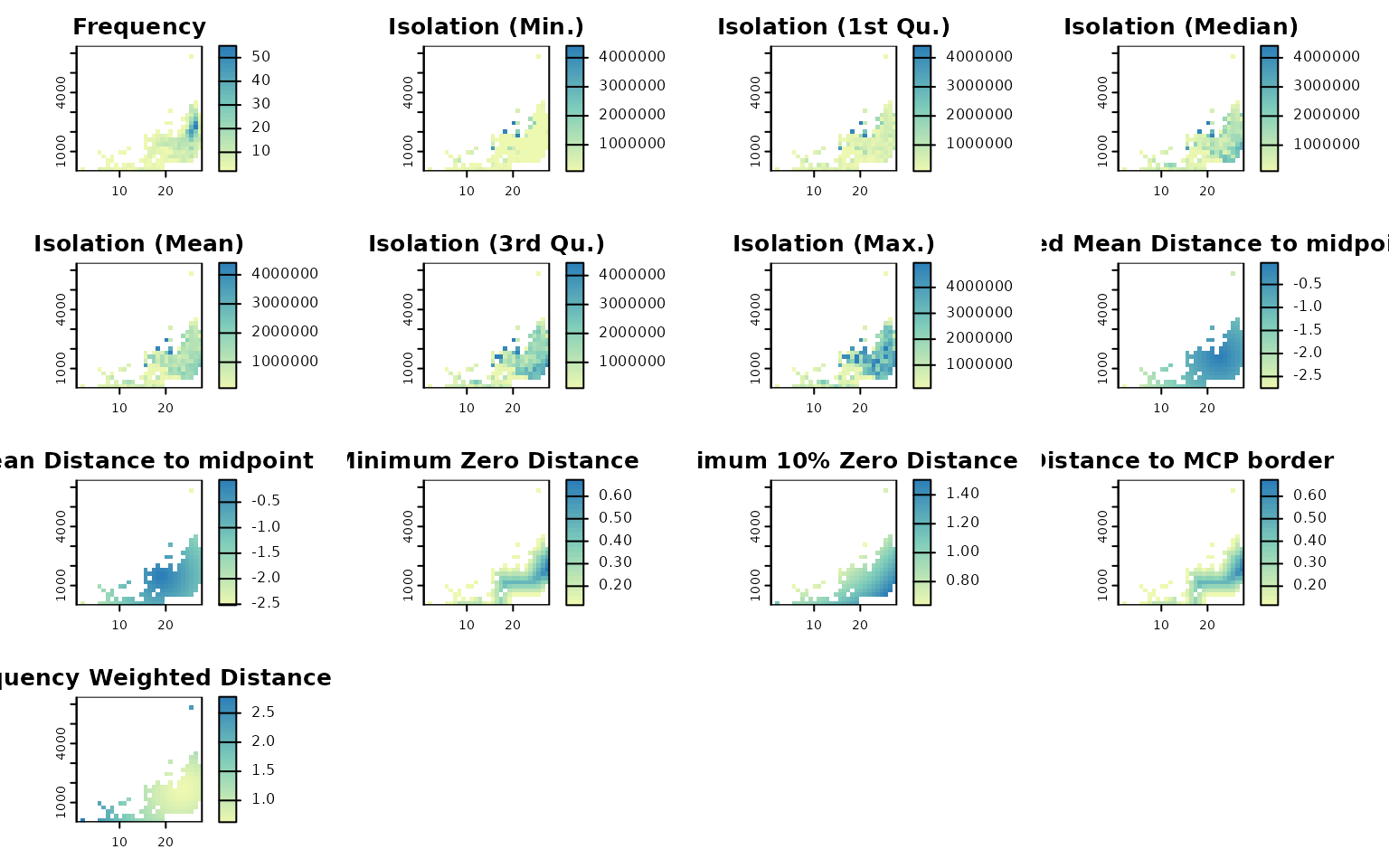 These descriptors often reveal whether species accumulate in central portions of environmental space or cluster near edges (where zero-richness neighbors are close), thereby sharpening inference about ecological filtering and range limits.