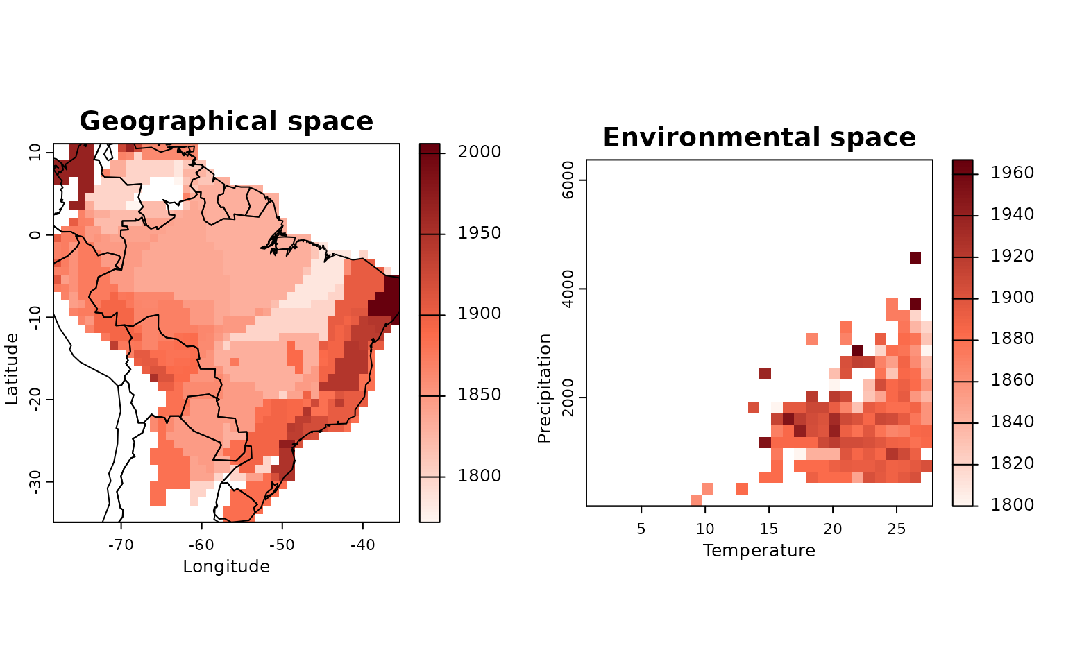 This plot shows species richness both in geographic (left) and environmental (right) space.
